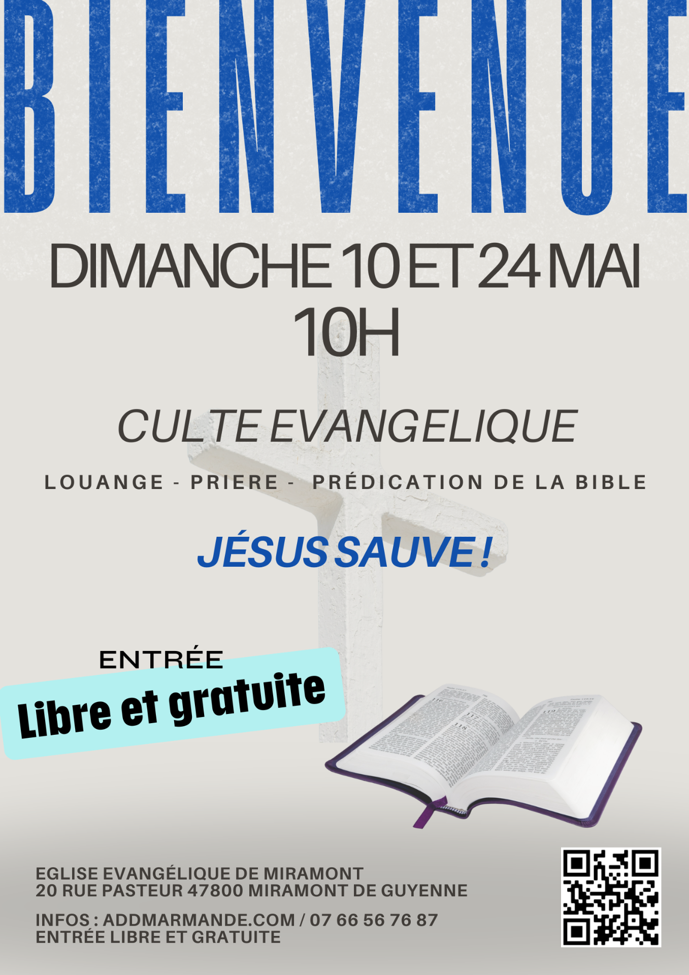 Les fidèles étant de plus en plus nombreux à nous rejoindre le mardi soir à 19h30 à Miramont, nous sommes heureux et avons la joie de t'annoncer cette bonne nouvelle : Nous venons d'ouvrir, un dimanche par mois, un culte évangélique à notre salle annexe. L'information est mise à jour tous les mois. En attendant :